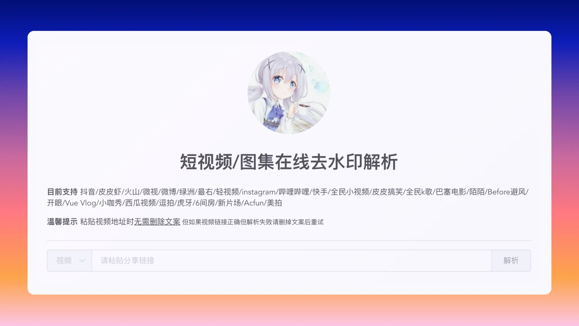 个短视频/图集在线去水印解析工具,直接将分享地址粘贴到输入框,即可下载无水印的视频,基本上国内绝大多数短视频都支持了,刚好需要下载一个视频,试了试,挺顺畅,挺好用。