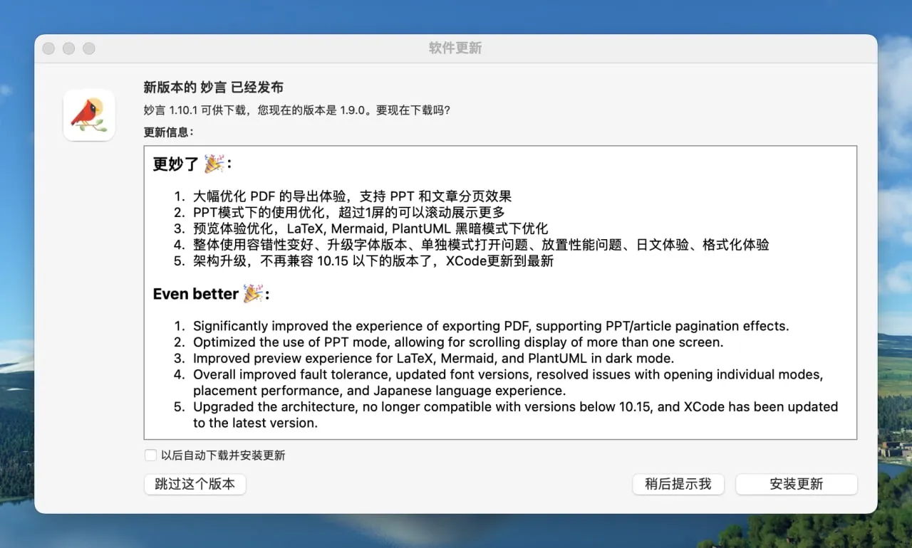 妙言最近发布了 V1.10 版本,本次最大的更新为大幅提升导出 PDF 的体验、PPT 使用体验、预览优化体验、架构升级等。