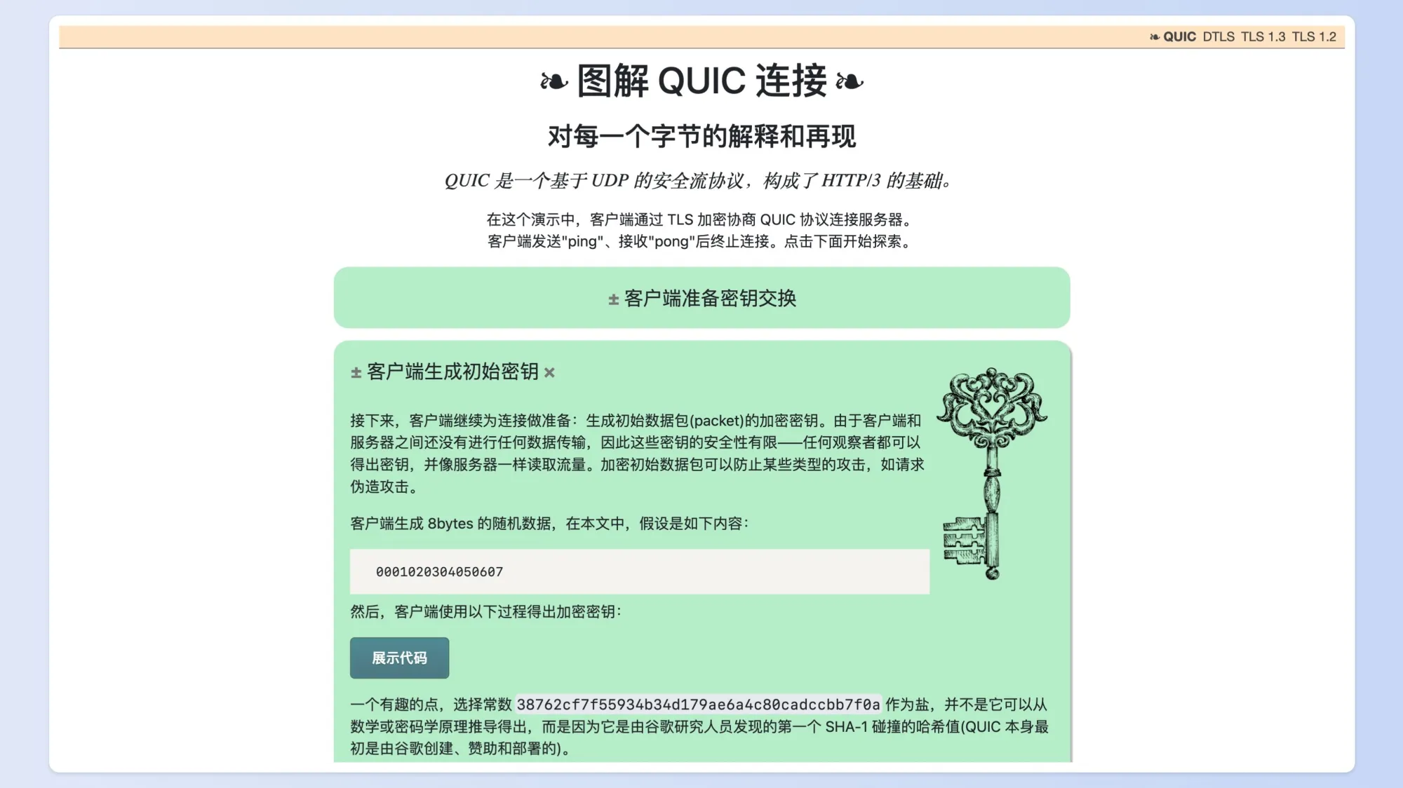 看到一个图解各类传输层协议的网站,包括 QUIC、DTLS、TLS1.3、TLS1.2 连接过程的详细图解,甚至还包括了代码实现,很适合对计算机基础底层感兴趣的同学。