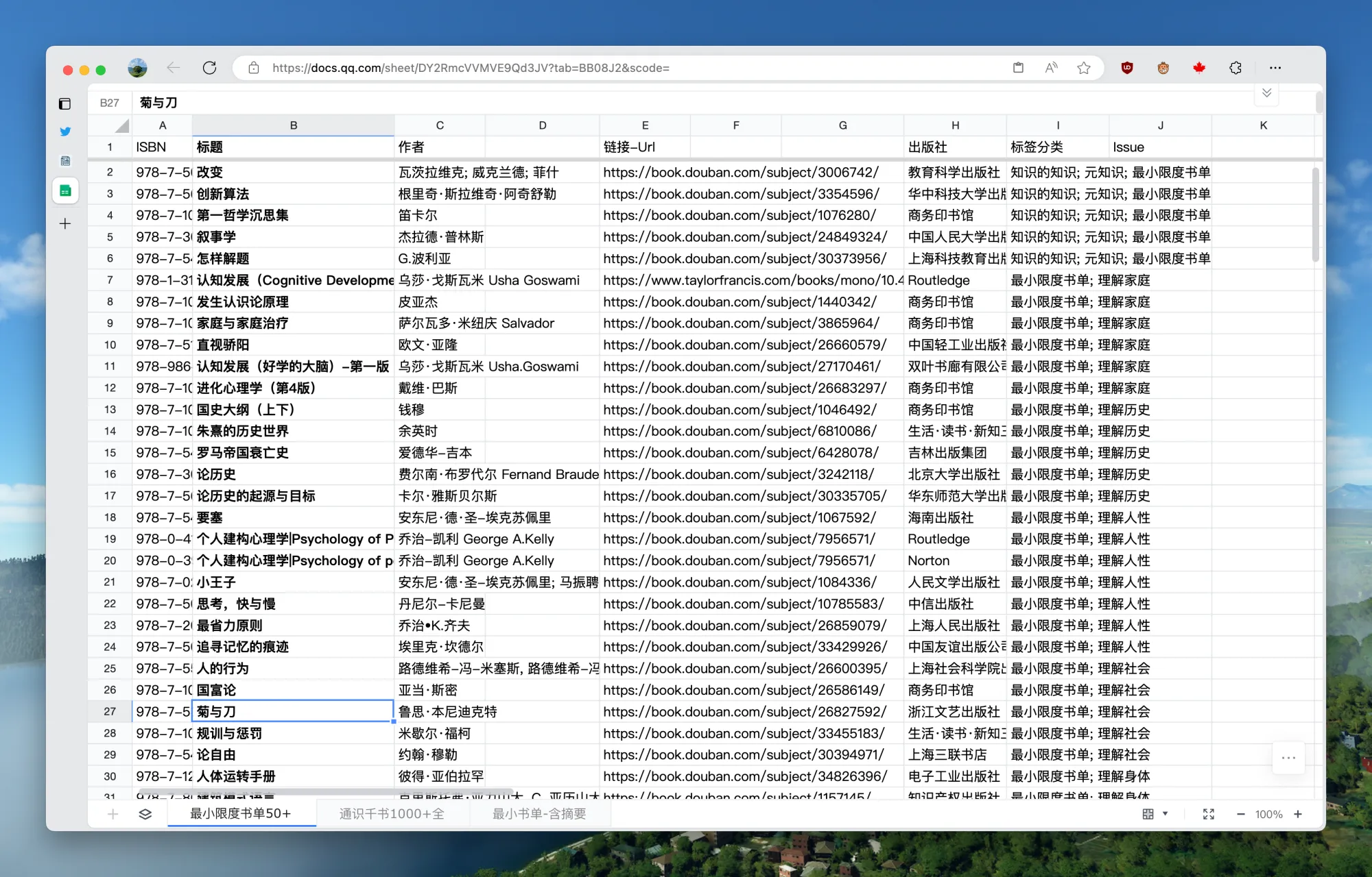 看到一个通识类的书单整理,来自于「聪明的阅读者」,包括了各个领域的知识和理解,很简单使用网页 Excel 直接整理,其中也分成了最小 50 本,以及完整的 1000+ 书籍整理,适合读书荒的朋友看看。