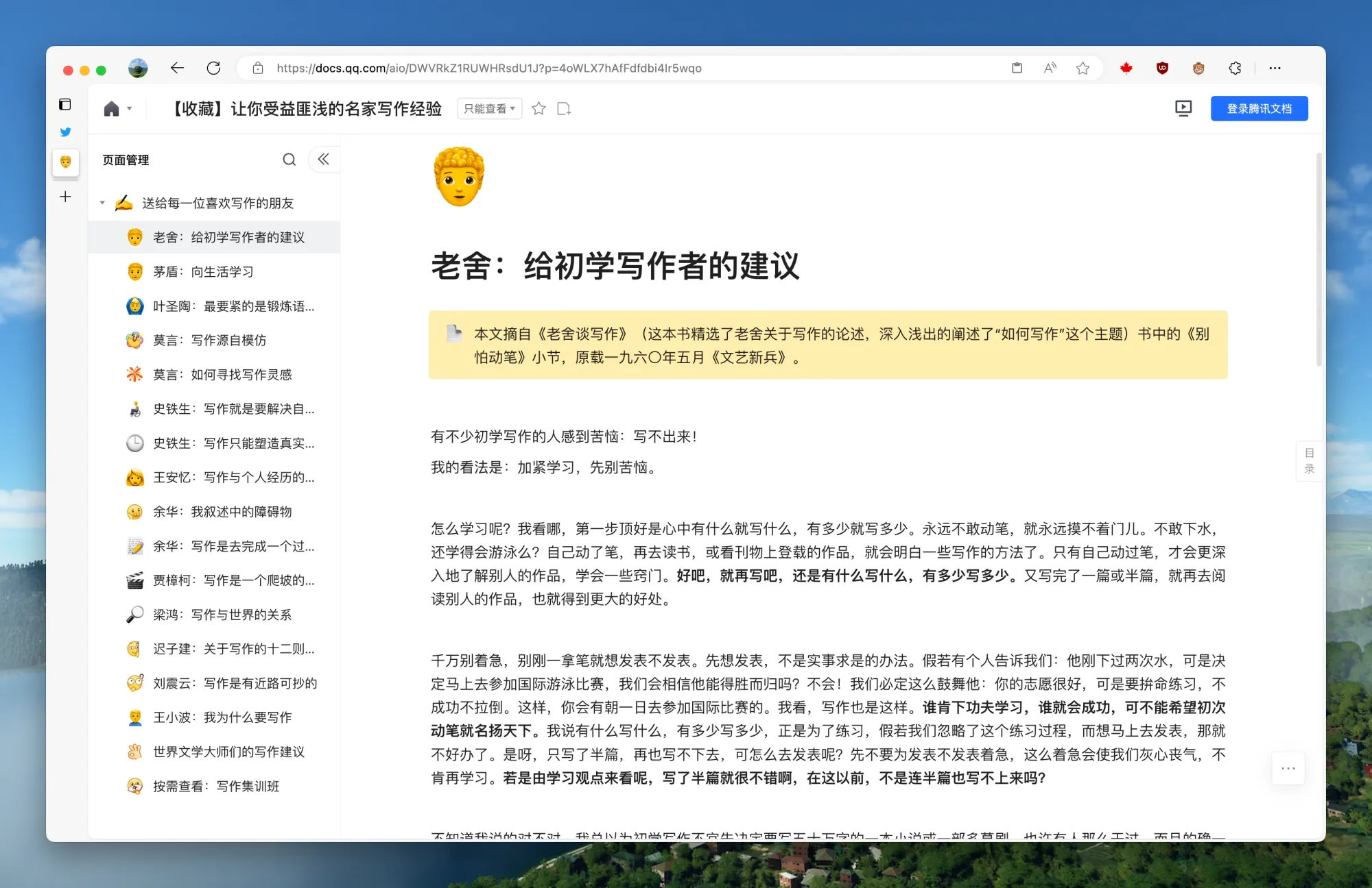 这个腾讯文档上面梳理的「让你受益匪浅的名家写作经验」还挺有趣的,居然有这么多老作家写过教你如何写东西的文章,发现越来越多的工程师其实不太愿意写东西了,或许也不太想写,也有可能动不了笔,不知道写啥,说不定可以看看作家行业是怎么弄的。