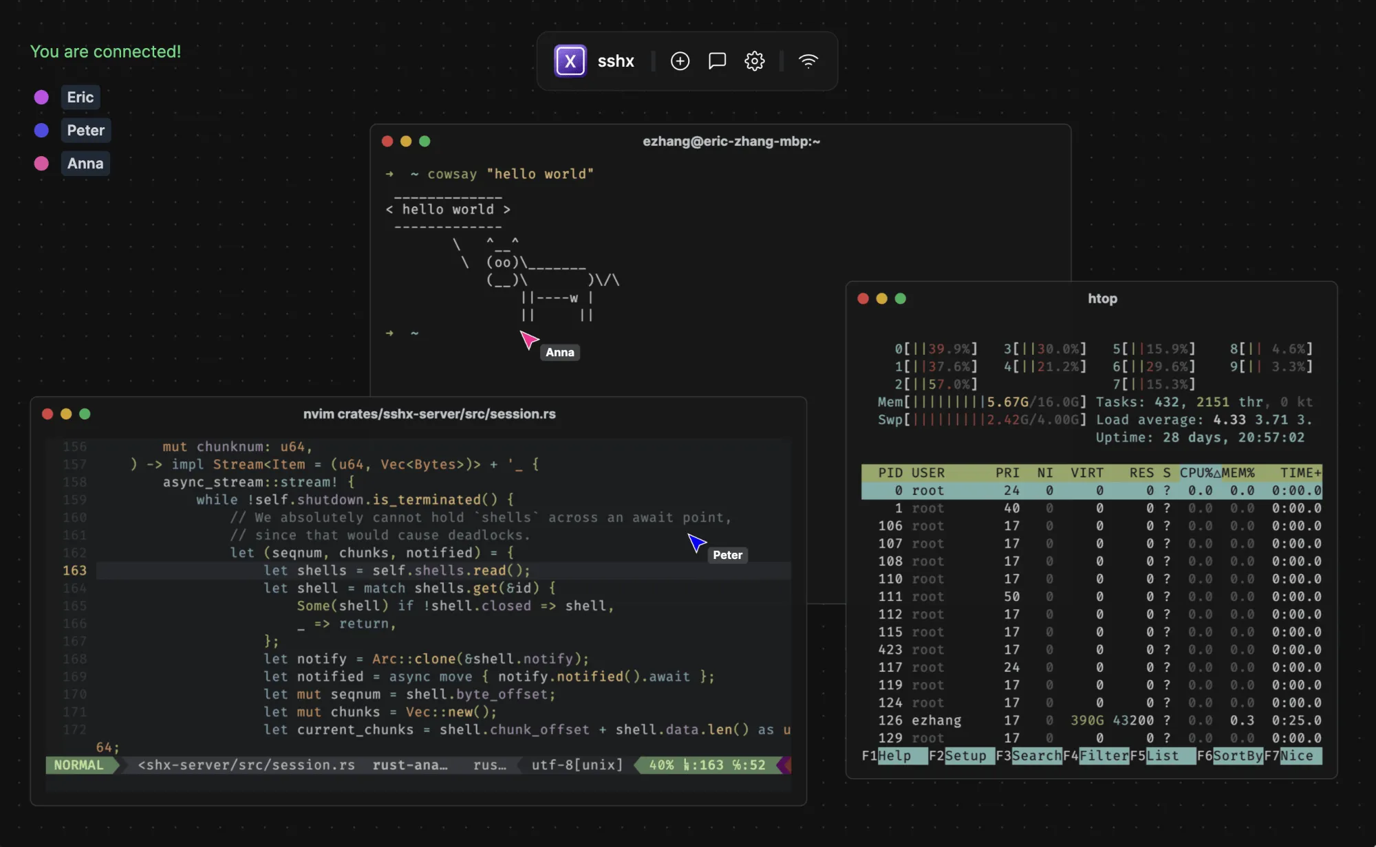 这个基于网络的安全协作终端 sshx 思路挺好的,允许在多人无限画布上通过链接与任何人共享你的终端,有实时协作、远程光标和聊天功能,挺适合教学、调试或云访问,安装起来也很简单。