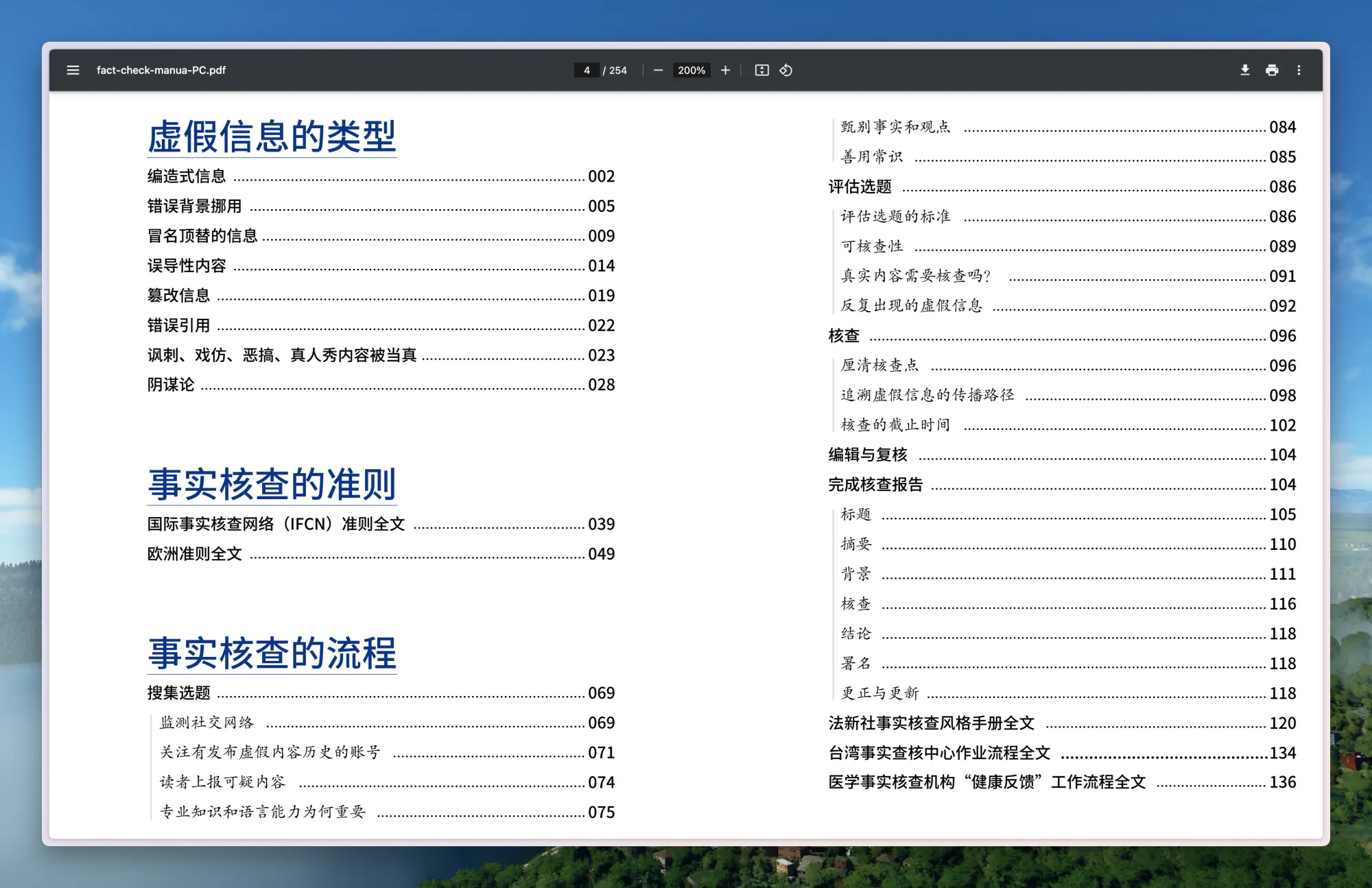 这个中文版「事实核查手册」挺值得一看,简中的虚假信息比想象的要多不少,这个手册以案例的形式介绍了常用的文字、图片和视频核查工具,也涉及事实核查的工作流程、信源评估,并译介了国际事实核查机构惯用的职业准则与实践。