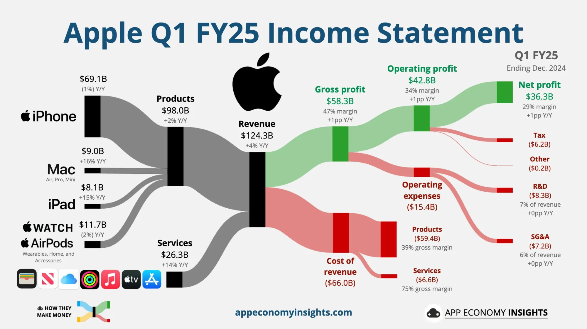 特斯拉、微软、台积电、Meta、苹果、谷歌最新财报拆解,如何赚钱和花钱的,来源于 App Economy Insights,挺值得一看。