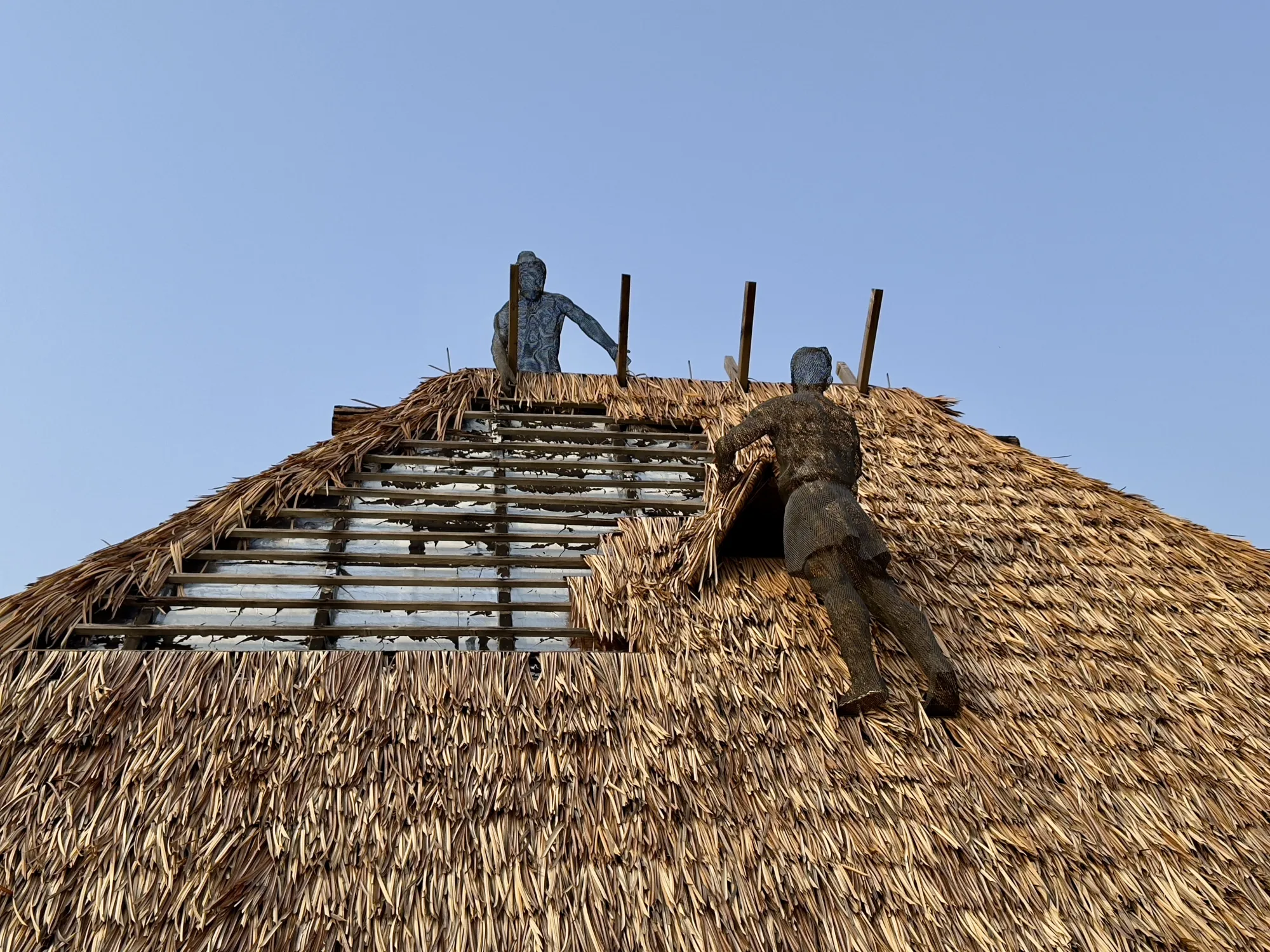 封面图拍摄于周末去良渚公园徒步,看到的一幕模拟当时遗址的古人修房子的场景,配合当时蓝天,挺好看的。