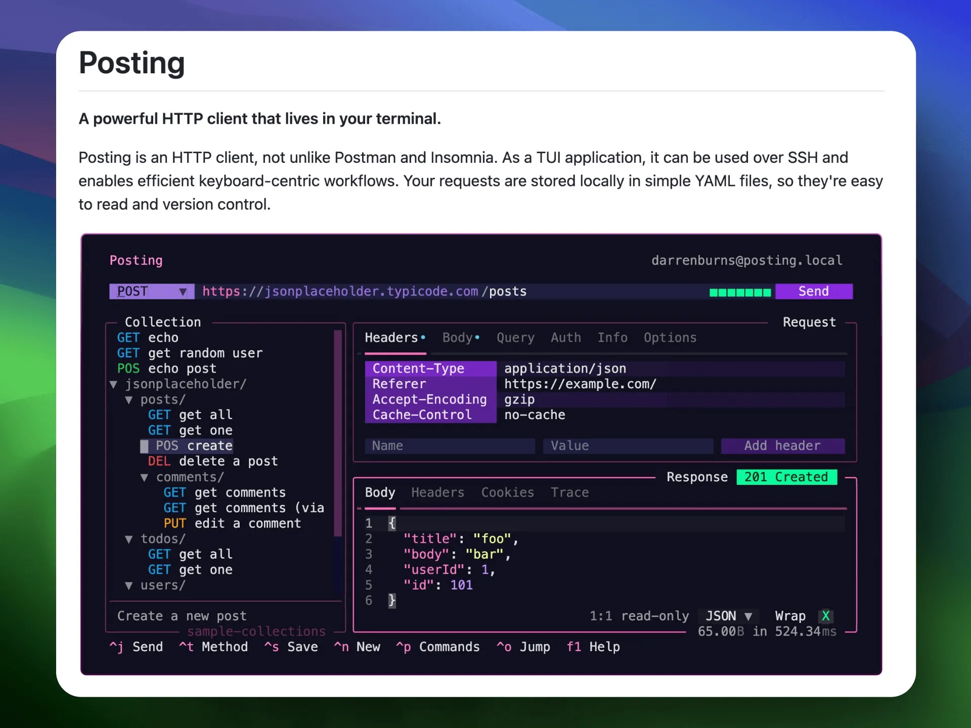 在 GitHub 上看到一个有趣的终端 API 测试工具 Posting,类似于 Postman 和 Insomnia 作用,不过用终端命令行来实现的确挺有趣和方便的,而且这个颜色主题我很喜欢。