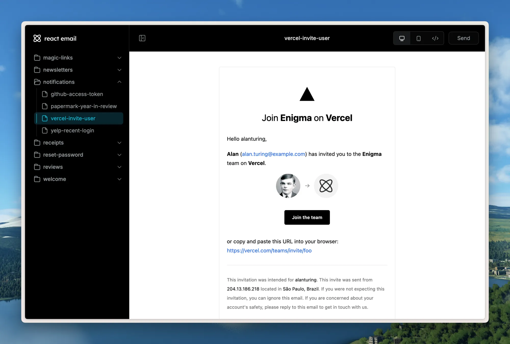 假如你的网站需要做发送邮件的功能,包括构建模板,可以试试 React Email 这个开源库,功能还挺丰富,使用也简单,类似于这种经常收到国外邮件的展示效果,也更现代一些。
