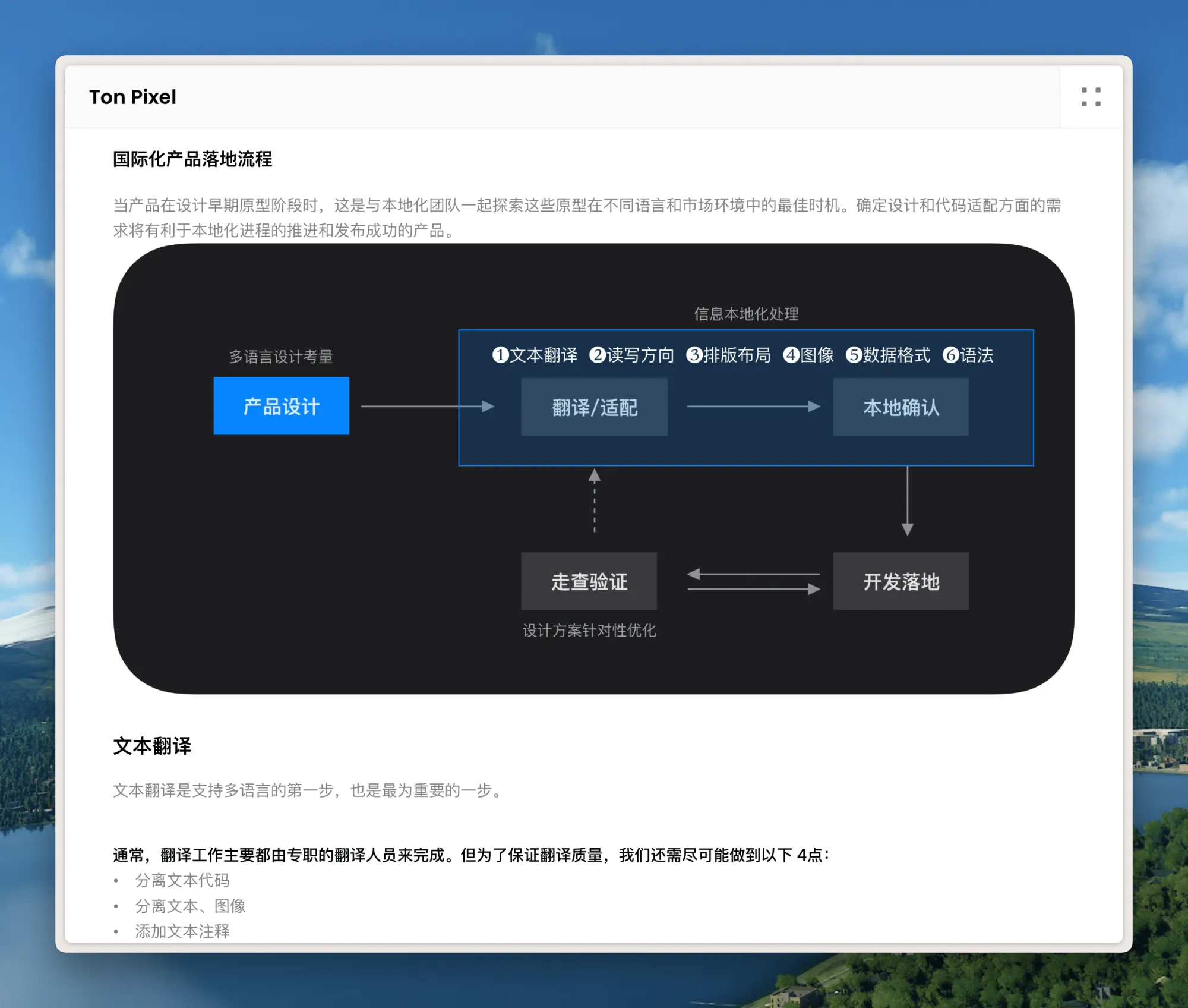 Ton Pixel 这个《国际化设计指南》挺值得一看,在不同场景在做国际化多语言以及本地化开发需要注意的点,很全面的整理出来了,让你做的过程中有一种 checklist 的感觉。