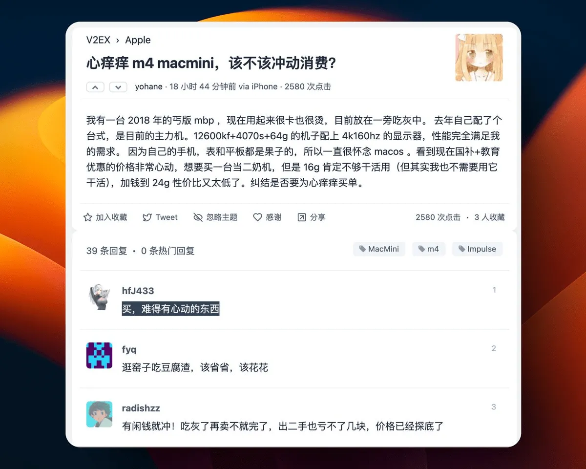 V2EX 上看到这个帖子,并不是对于 Mini 这个事情感兴趣,而是对下面这条回复「买,难得有心动的东西」挺感触的,我想也慢慢保持这种心态,假如这个东西是需要的,又是自己心动的,在价格上假如负担得起,那就买。年纪越大越觉得不要把想买的东西留到以后买,因为等到你老了时候已经没有当时感受了。