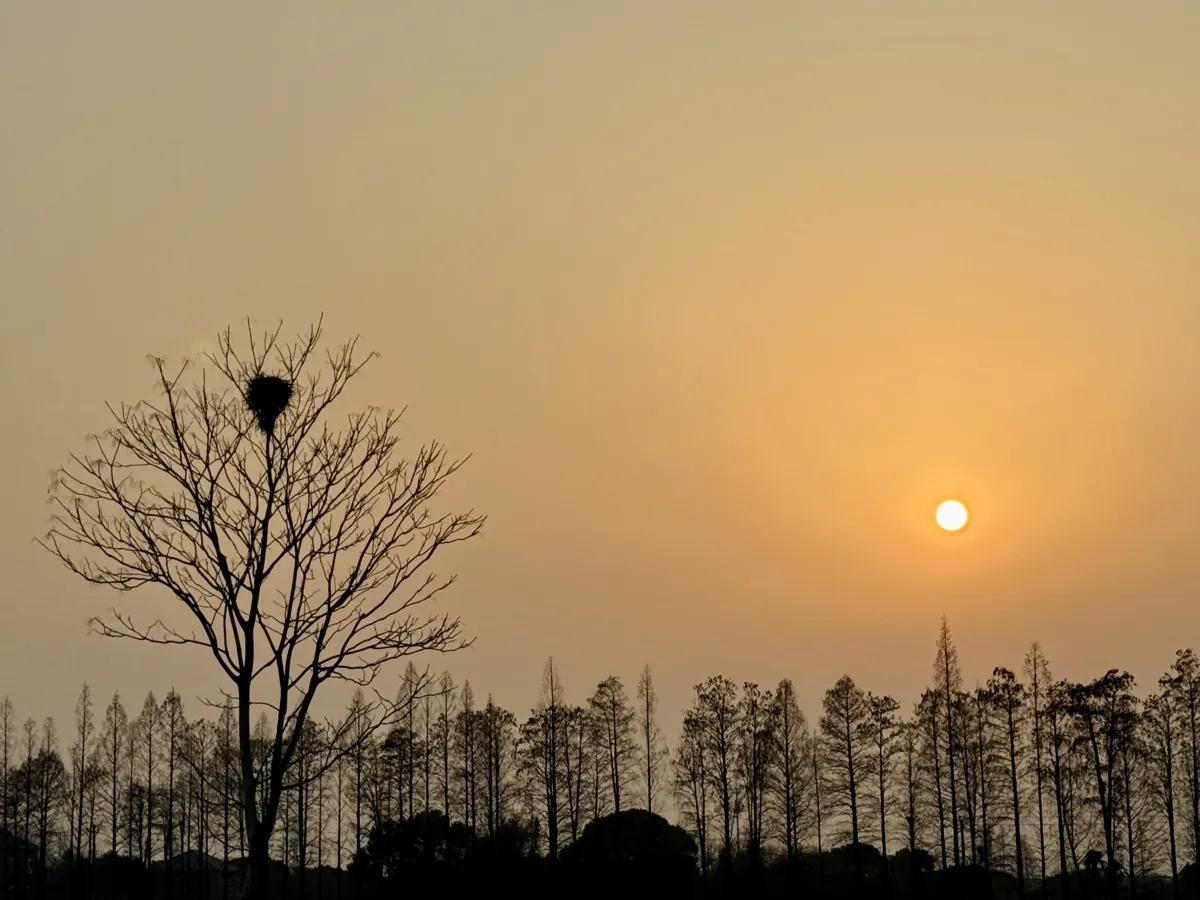 封面图拍摄于周末的落日,搭配着笔直有序的树,树上还有一个鸟窝,属于今年看到的最好看的落日。