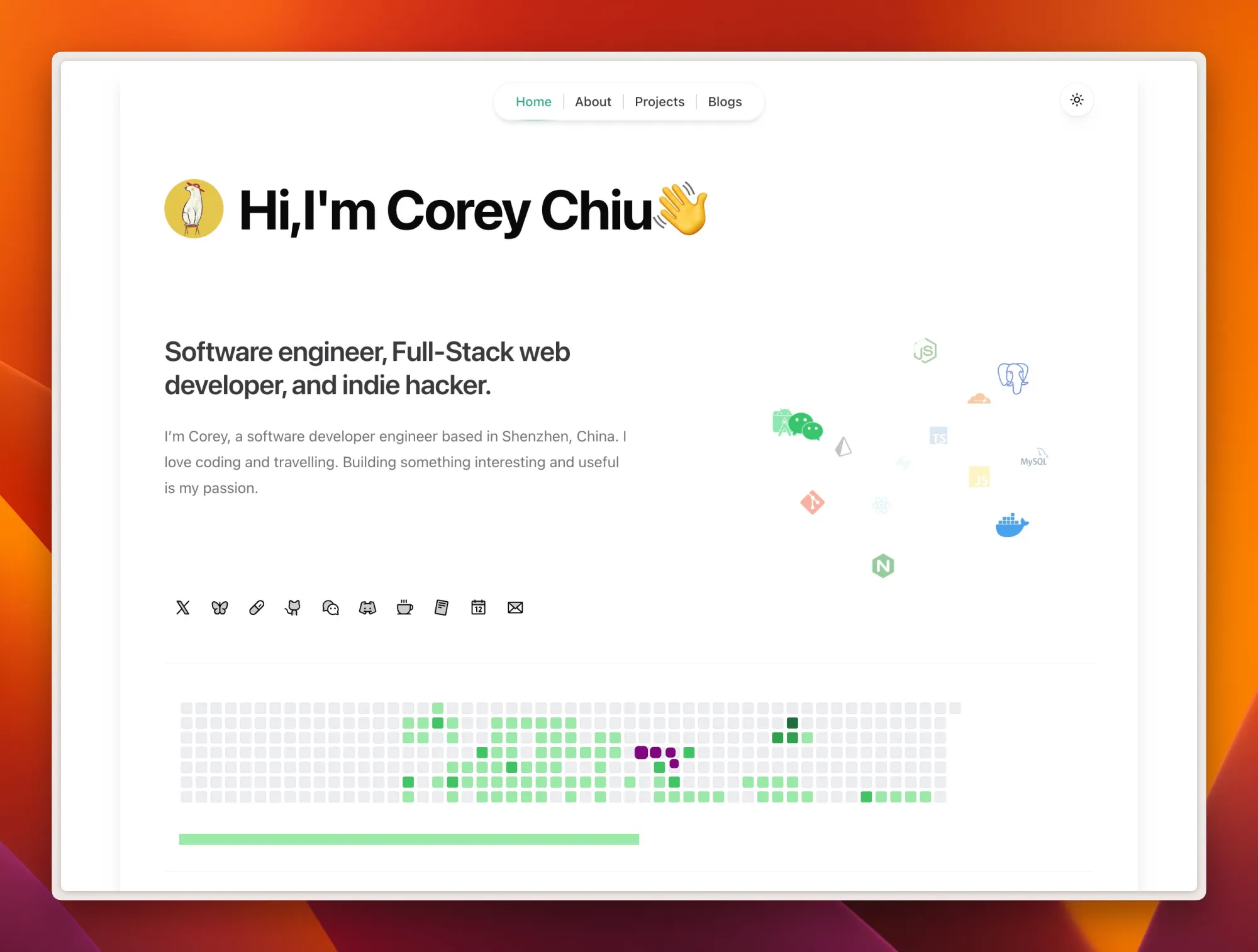 这个博客主题非常适合有作品的工程师来使用,可以很好的把你的社交媒体、做的作品、开源、最近的动态思考、博客挺好的展示出来,美感在线。