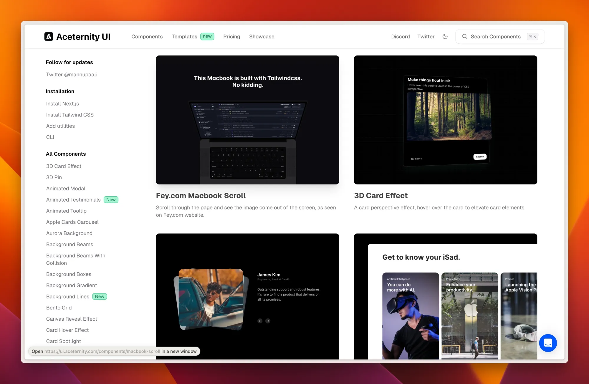 这个 Aceternity Ul 代码库不错,Make your websites look 10x beautiful,提供了不少 Tailwind CSS 组件可以直接复制粘贴使用,不过找到自己常见更合适的会比乱加好不少,当然也可以当做代码效果欣赏也不错。