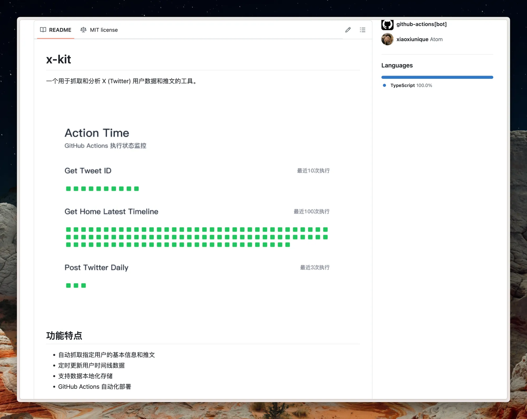一个用于抓取和分析 X (Twitter) 用户数据和推文的工具 x-kit,自动抓取指定用户的基本信息和推文,定时更新用户时间线数据,支持数据本地化存储,GitHub Actions 自动化部署,可以用它来做点有意思的事情,比如在你的博客展示你最近的发布内容。
