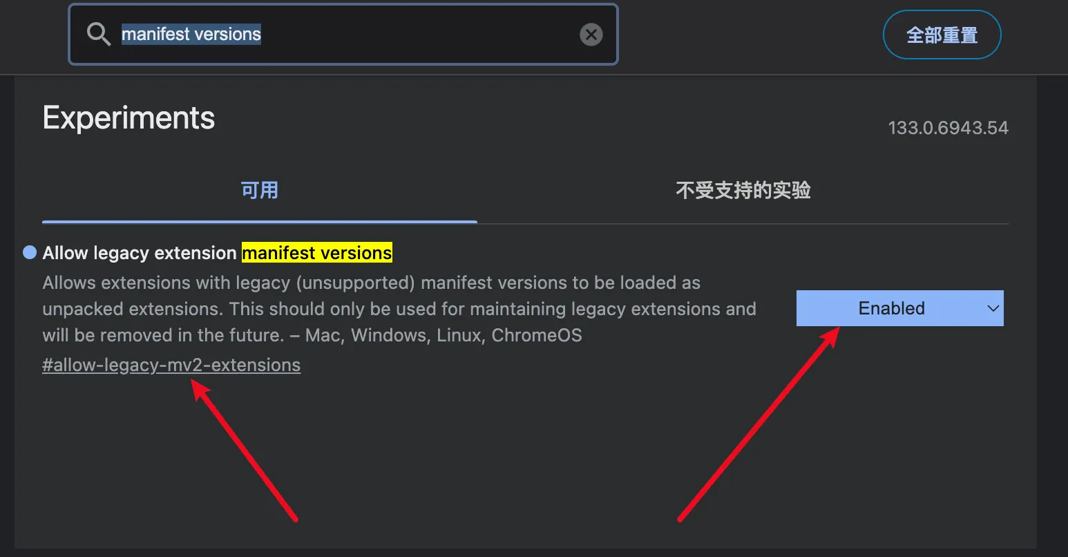 老的 Manifest V2 被限制使用了,可以打开 Chrome 浏览器,输入这个地址:chrome://flags/,在搜索框输入:manifest versions,将 default 改成 enable 即可启用 Manifest V2 兼容性,感谢这个作者。