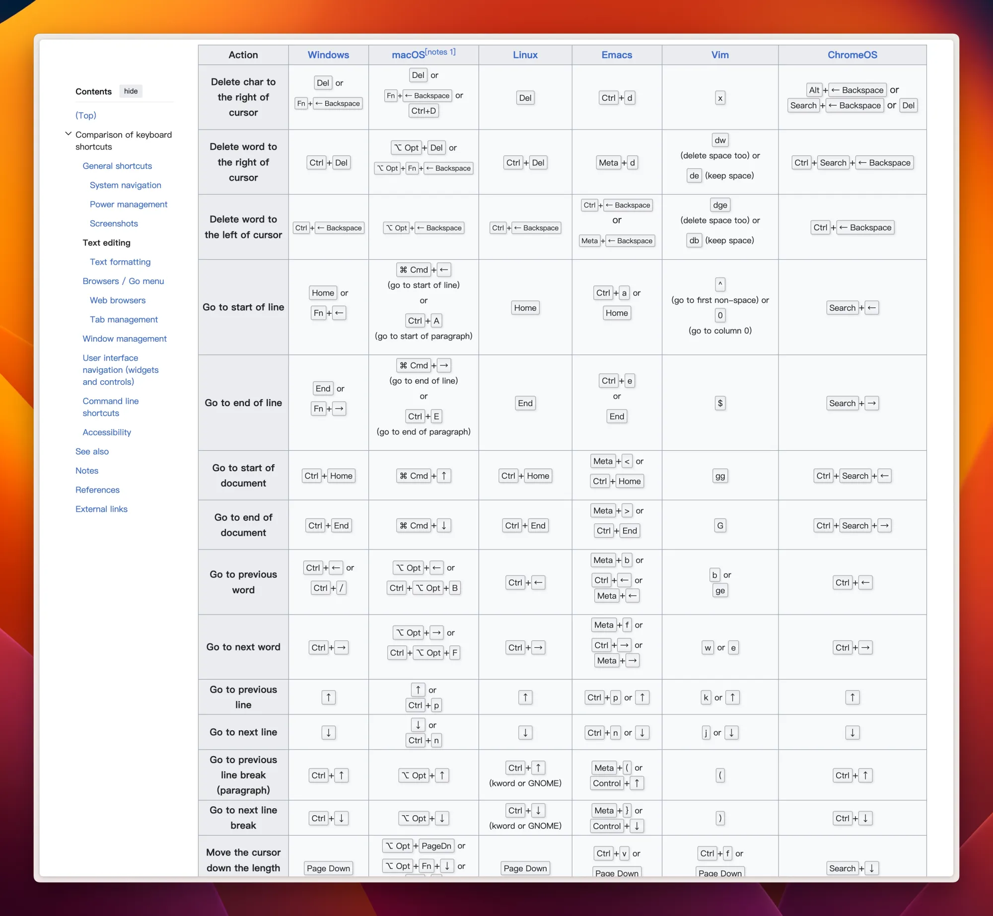 好东西,维基上的关于键盘快捷键的梳理表,绝对比你想的要多很多,包括各种系统对应的快捷键、文本编辑快捷键、窗口管理快捷键,同时我感觉也适合做同类软件的快捷键配置参考,找一些常用的记下来挺好。