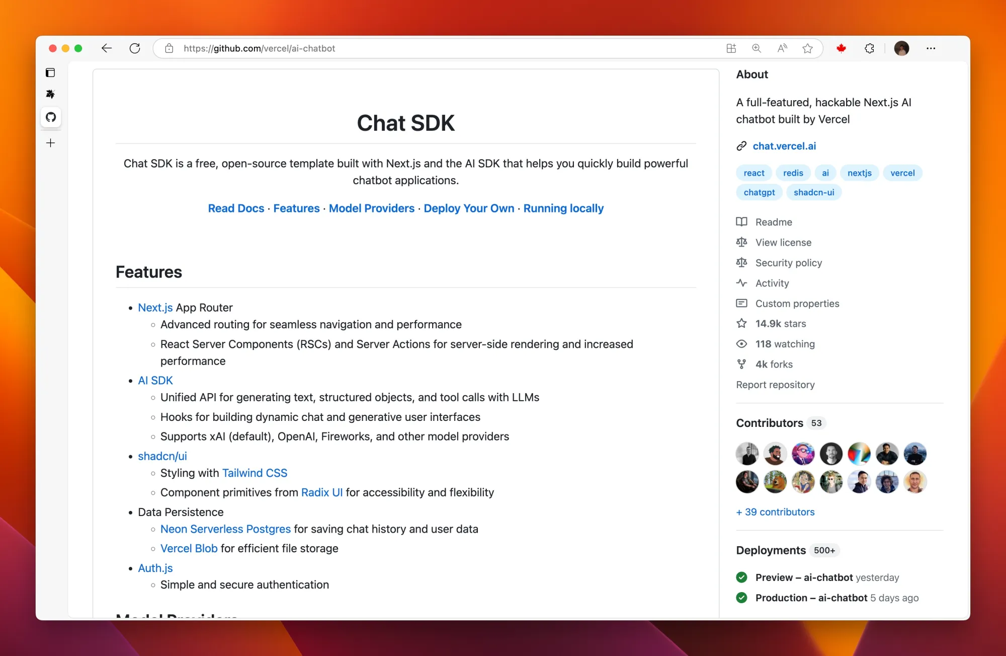有兴趣的小伙伴可以看看 Vercel 开源的这个 Chat SDK 项目,一个基于 Next.js 和 AI SDK 构建的免费开源模板,帮你快速构建一个效果还不错的 AI 聊天应用,当然我感觉更重要的是可以学习他代码的写法。