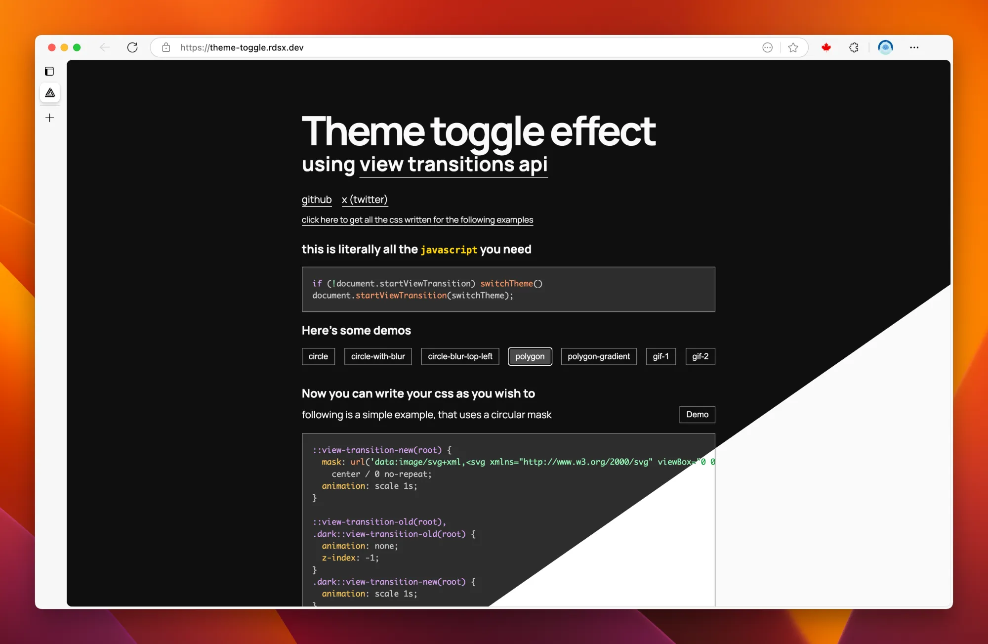 这个网站的明暗主题一键实现的效果挺好的,使用 view transitions api,直接 Copy 代码就可以使用,省去了一些自己写适配的成本。