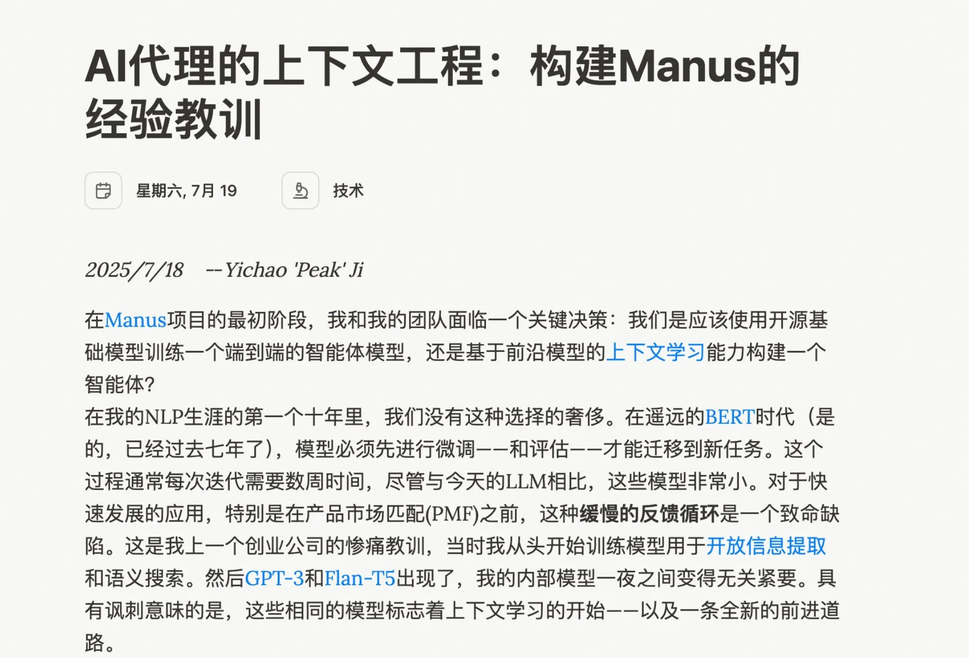Manus 这篇文章值得一读 「AI代理的上下文工程:构建Manus的经验教训」,把不少内部探索过程中踩坑的东西给分享出来了,挺好的。