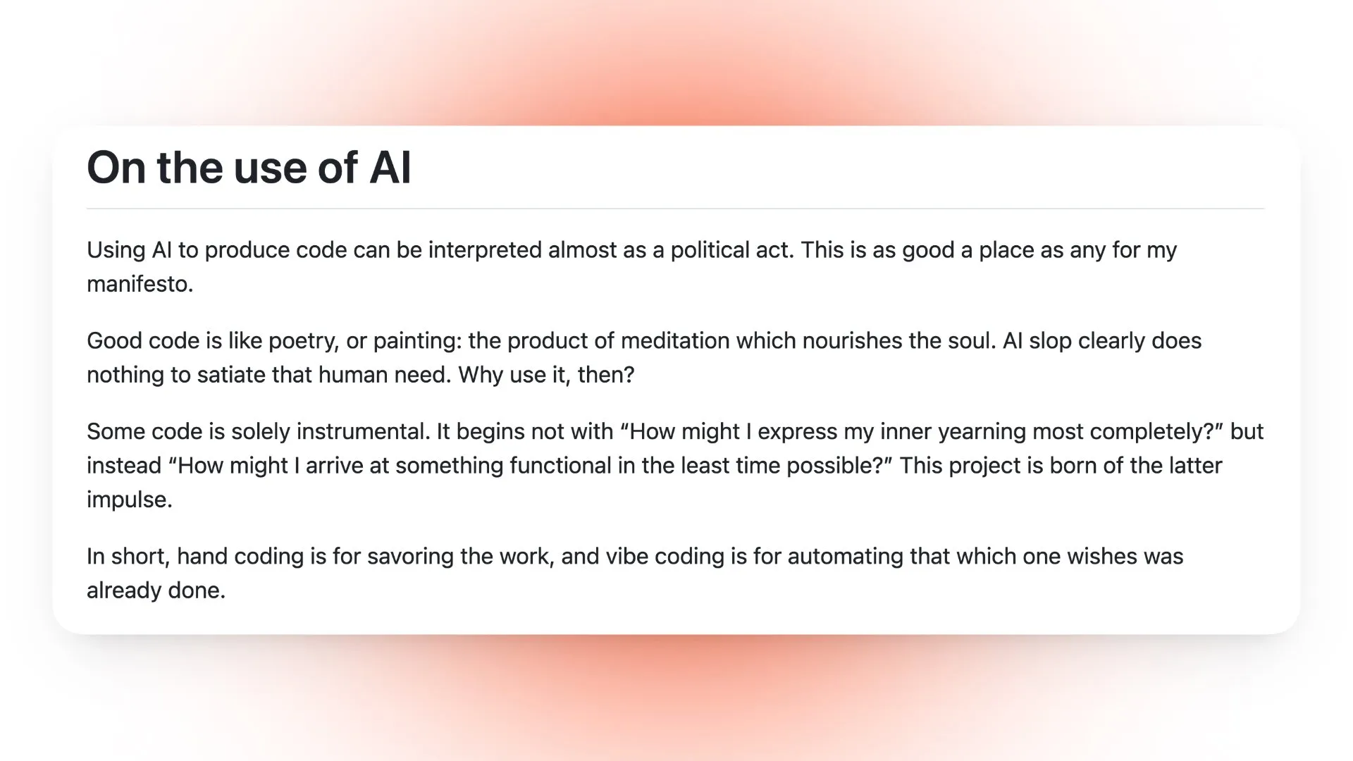 手写代码,是为了创作本身的质感和审美,而 AI Vibe Coding 是用来自动化那些我早就希望已经写完的部分,好让我把时间留给真正想投入心力的事情。