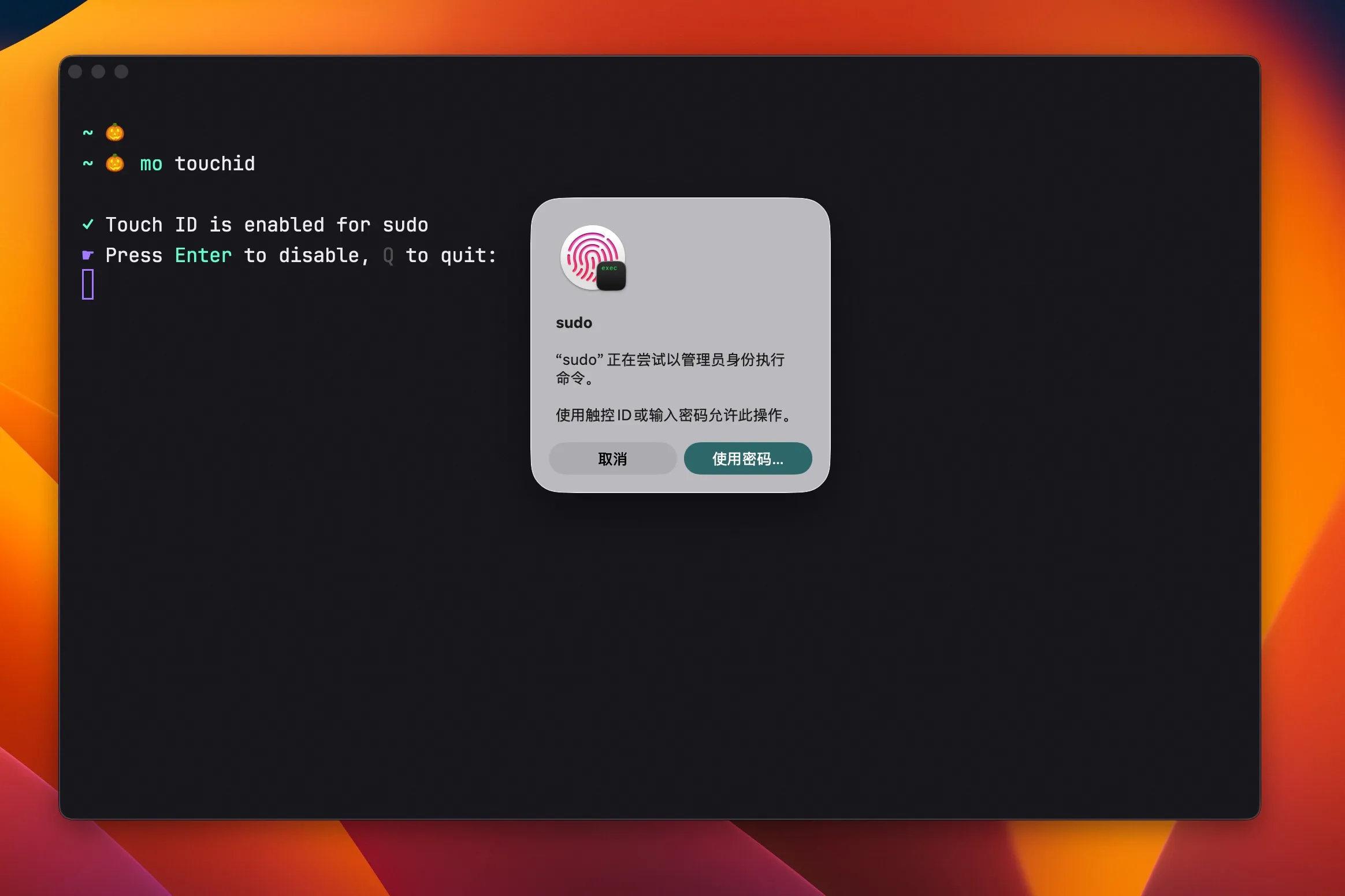 Mac 很多时候我们用命令行工具执行系统动作时候,都需要手动输入开机密码,之前一直想有没有办法用指纹的方式,后面 mole 支持了这个功能,直接 mo touchid 一键设置后,后面所有的命令行需要系统权限的时候,你只需要手指按下指纹就 OK 了,非常方便,属于 mole 的一个非相关功能了。