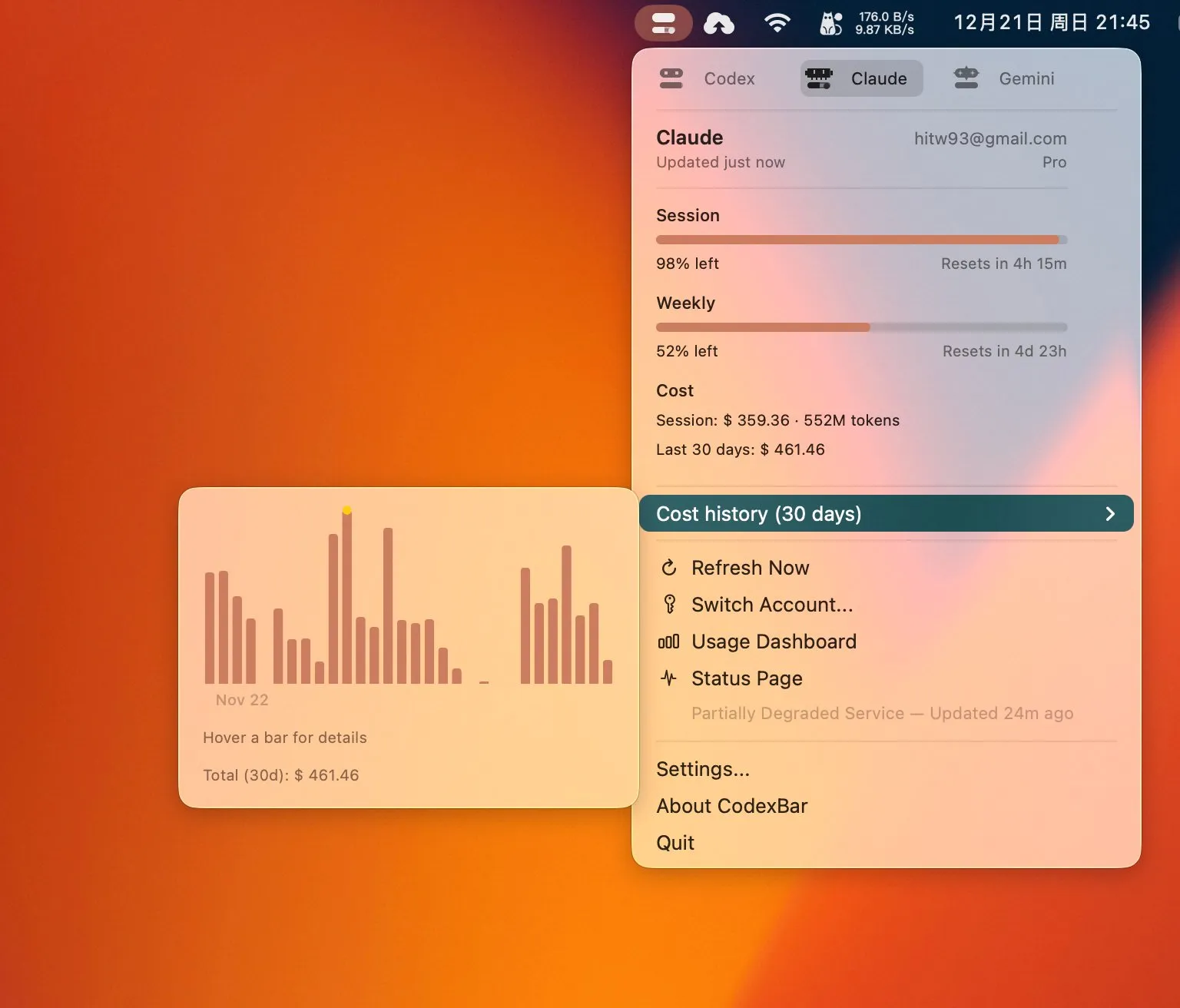 CodeyBar 这款 Mac 应用相当不错,如果你使用 Codex、Claude Code、Gemini 这些几款编码工具,安装后可以轻松从菜单栏看到你的使用情况和状态,非常方便,对我来说非常必要,感兴趣的朋友可以试试。
