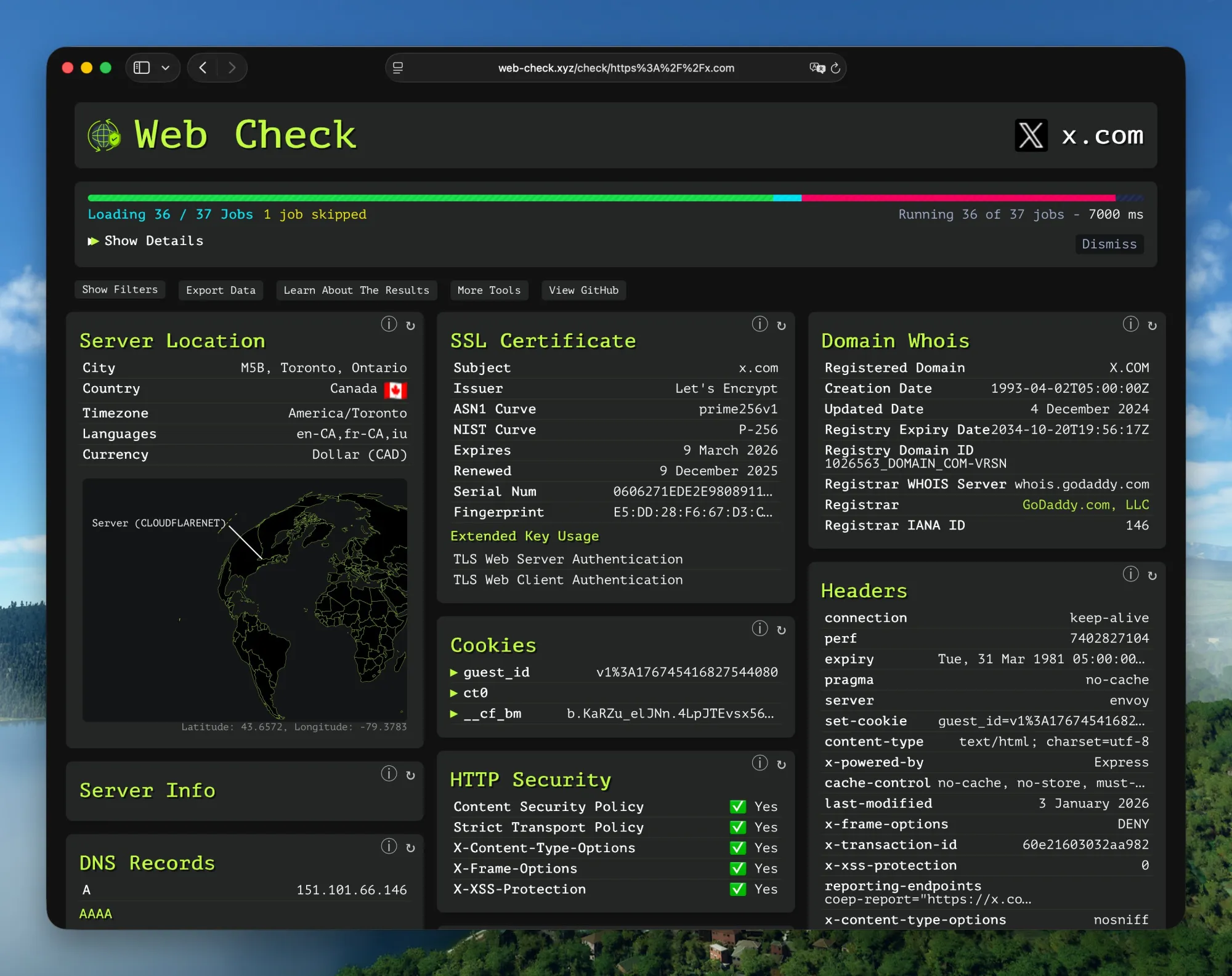 最近发现一个挺有意思的网站检查工具 Web-Check,整体偏 hacker 风格。它可以把一个网站的几乎所有底层信息都拆给你看:IP 与服务器位置、SSL 与 DNS 记录、Cookie、域名信息、爬虫规则、跳转历史、开放端口、Traceroute、DNSSEC、站点性能以及关联主机等,信息密度很高,适合随手查一查好玩的。