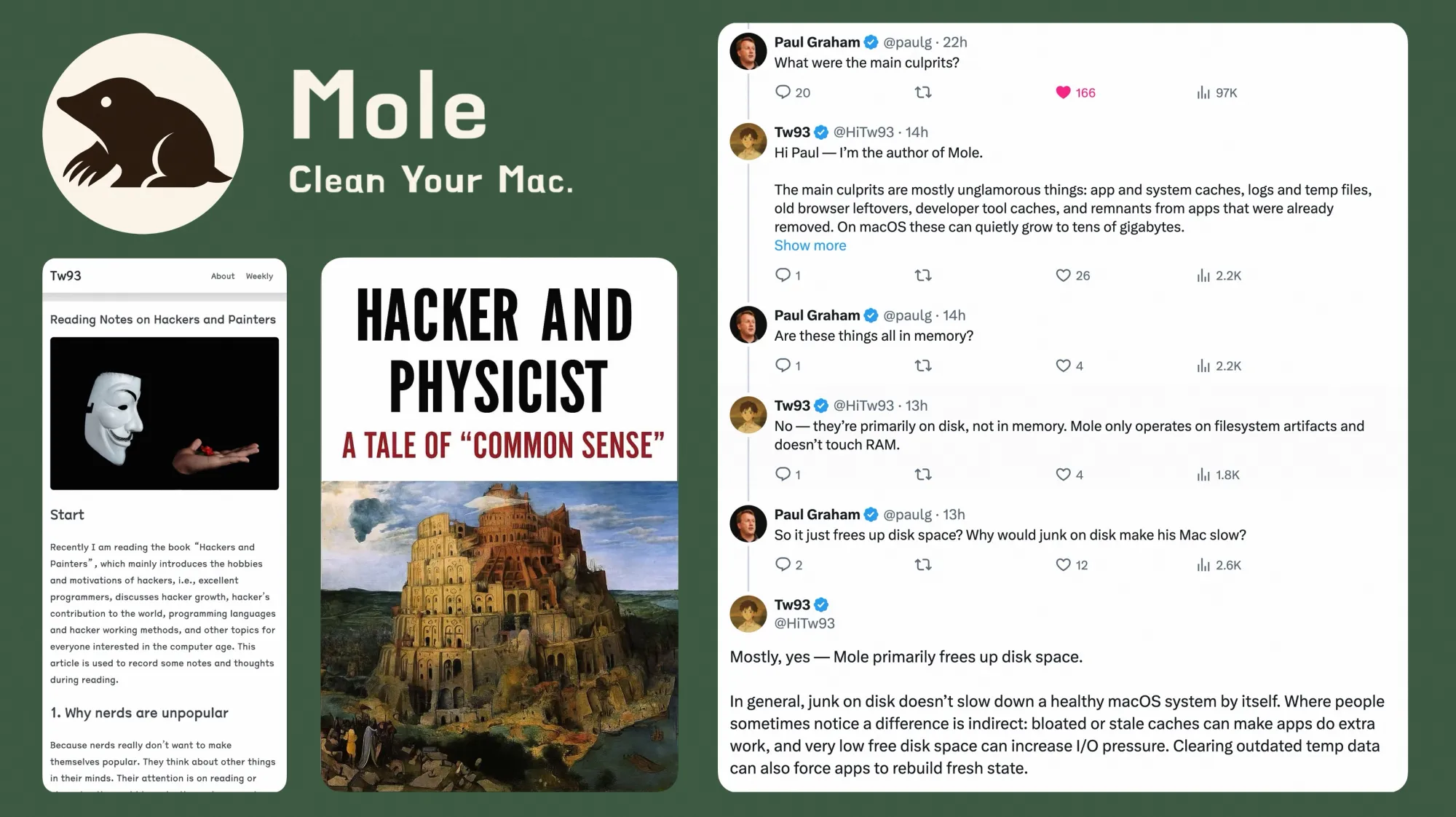 这次我想先和大家分享一个好消息,通过 Mole 这个产品,我意外地和我的技术偶像 Paul Graham 沟通上了,10 年前大二那年,我在大学图书馆翻到了《黑客与画家》这本书,对我影响非常大,那段时间我一直在思考我想成为什么样的角色,这本书一下子点醒了我,工程师不仅是极客,也可以是具备审美能力的画家,这也影响了我后面做的很多作品,都会尽量保持简单、易用、美观,同时真正解决问题,能通过 Mole 这座桥梁和他产生联系,对我来说真的很神奇。