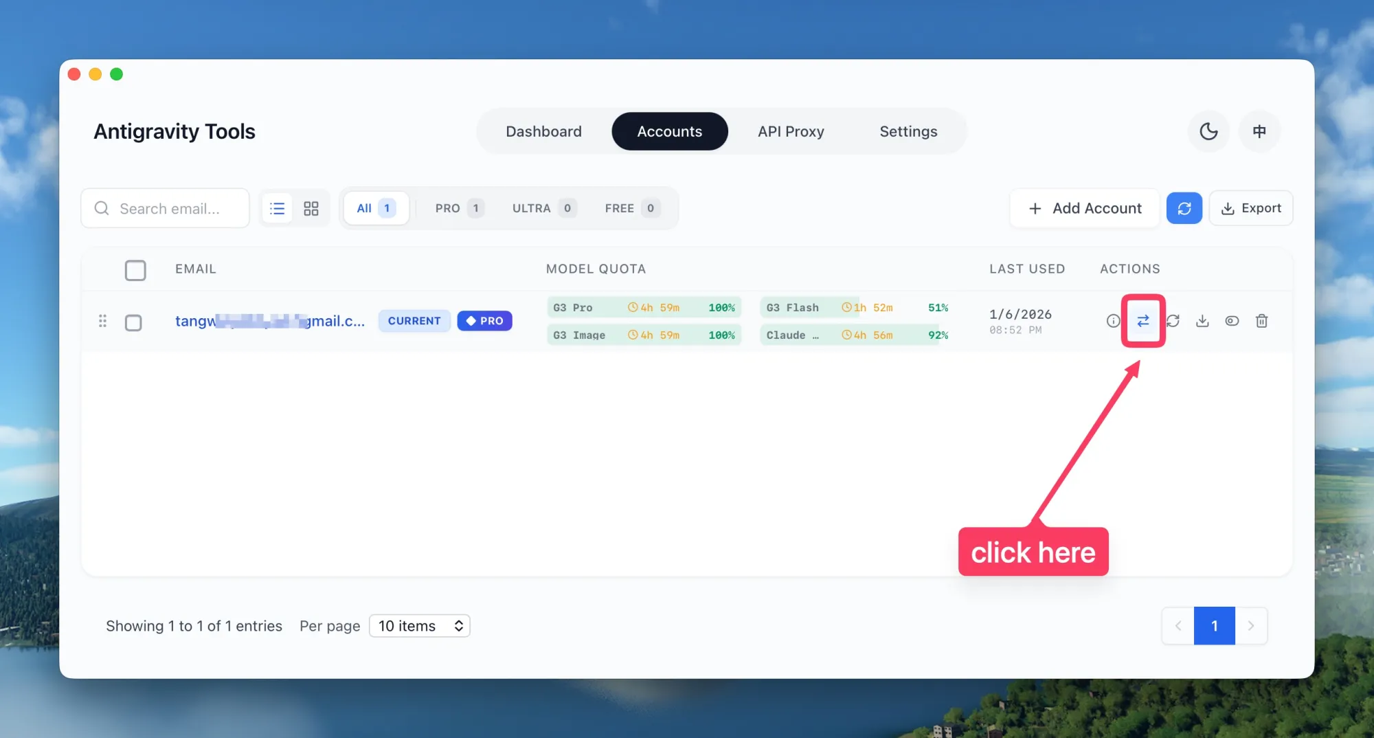 小伙伴发现一个打开登录 Antigravity 账号的方式,确保你的地址是美国,年龄符合情况下,也很有可能登录不上,试了很多方法都不行,最后想着用 antigravity-tools 转发使用,没想到它有一个一键打开功能,登录后点击下面这个,一键换气居然可以直接可以使用了,很神奇,分享给需要的朋友。
