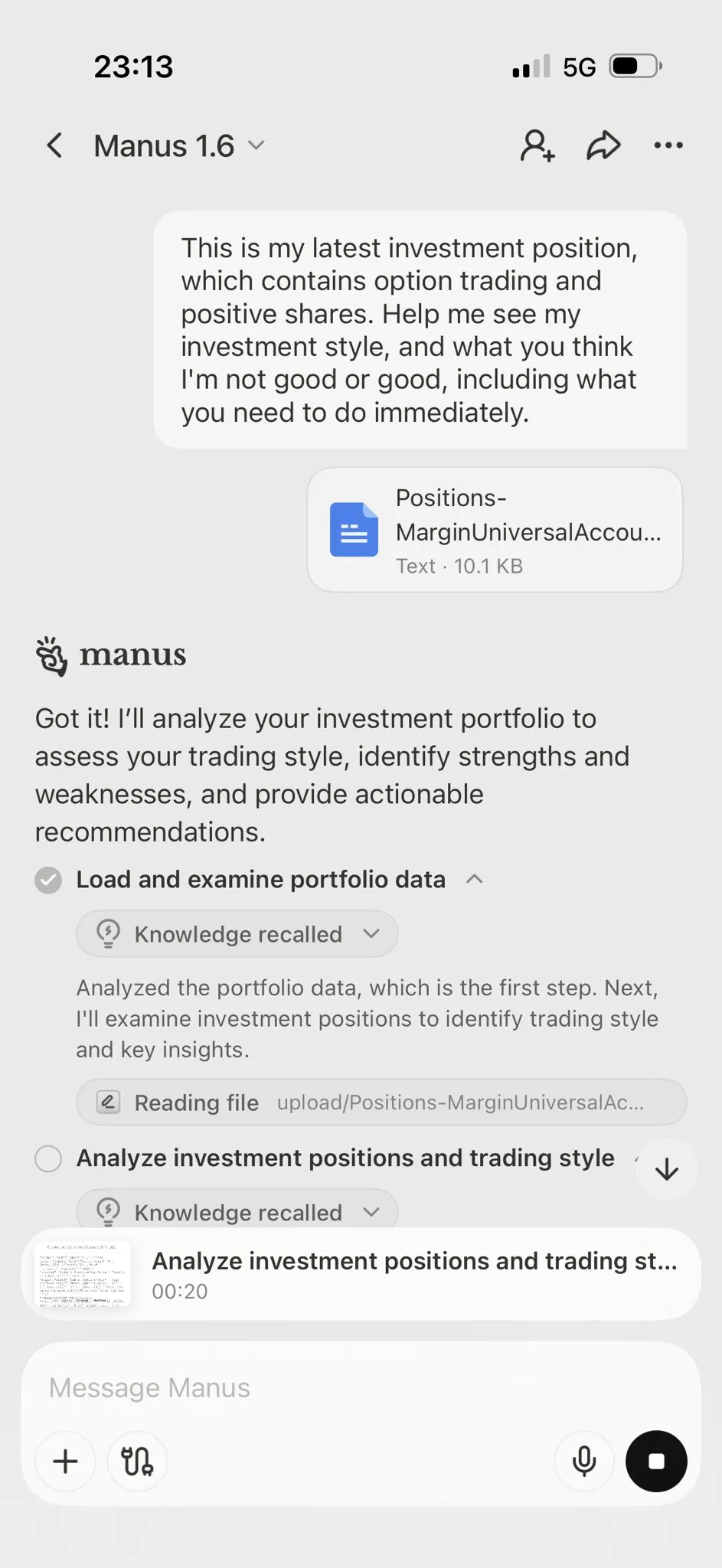 假如你也在投资,很建议把你的持仓记录和交易导出,发送给 manus 让他帮你分析优劣,我测试下来,相比 Claude、ChatGPT、Grok、Gemini 的使用效果都要好。