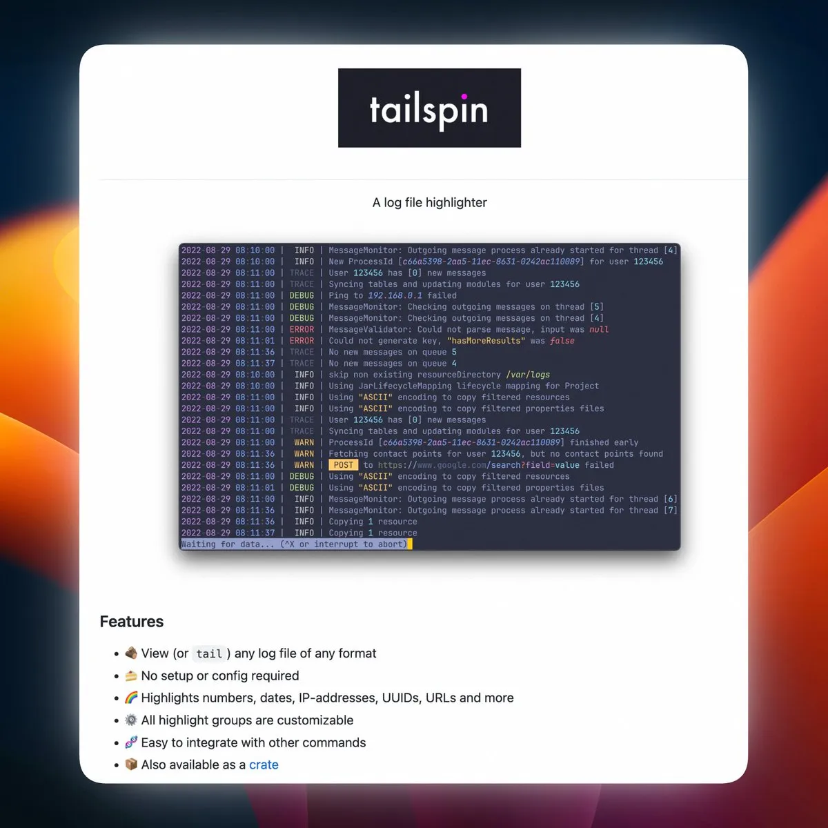 如果你经常在终端里看日志,tailspin 可以试试。它会逐行用一套聪明的正则去扫内容,把时间戳、数字、严重级别等关键信息自动上色,不要求日志遵循固定格式。基本不用配配置,也不用折腾,换不同项目的日志文件或管道流都能直接用。