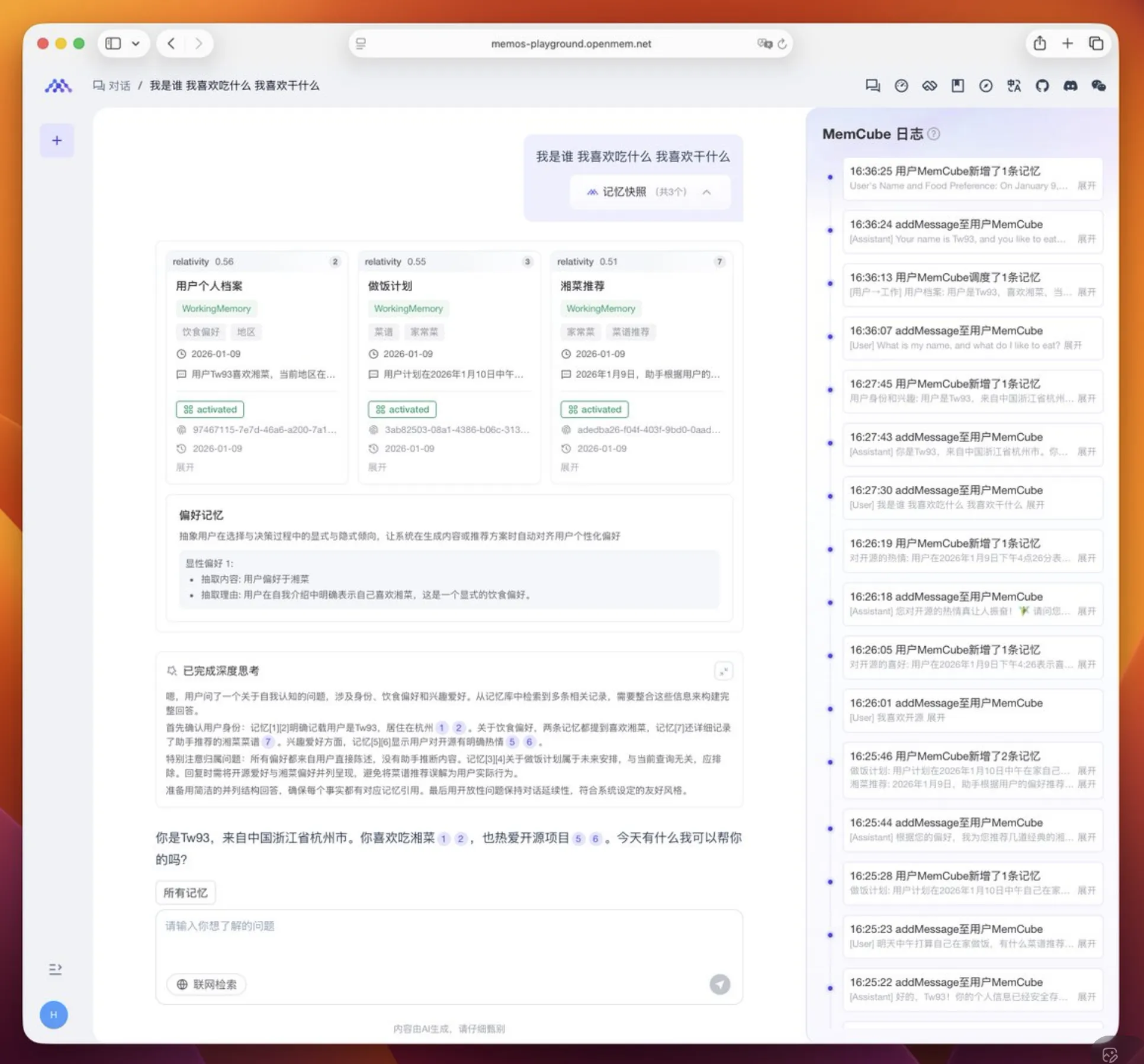 使用上支持把文件和 URL 直接接入知识库。对话过程中记忆会持续更新并随着增长逐渐形成偏好记忆,并且能把文本、图片、文件、工具调用等信息统一纳管,必要时还能使用自然语言对已有记忆做纠错和清理。有兴趣的小伙伴可以去项目里面玩玩看。
